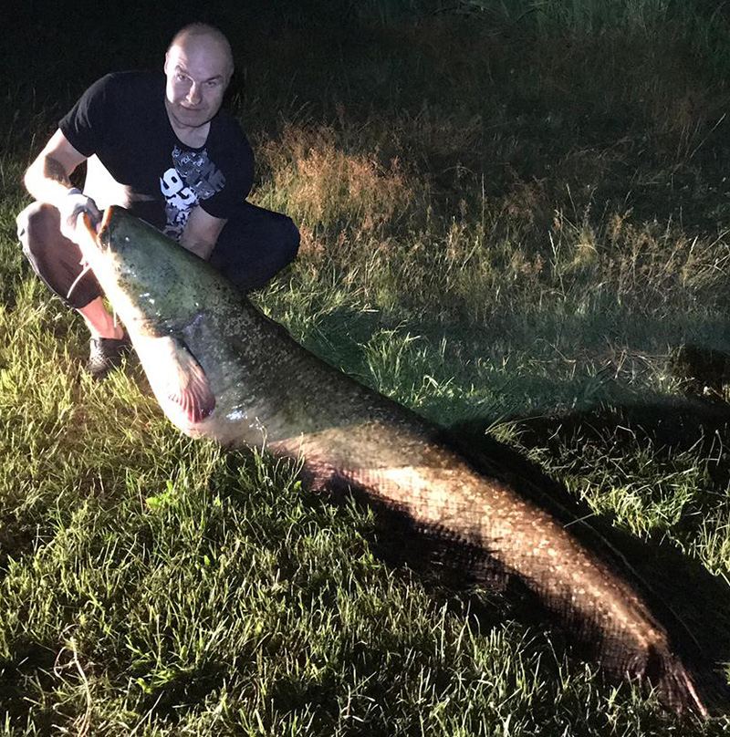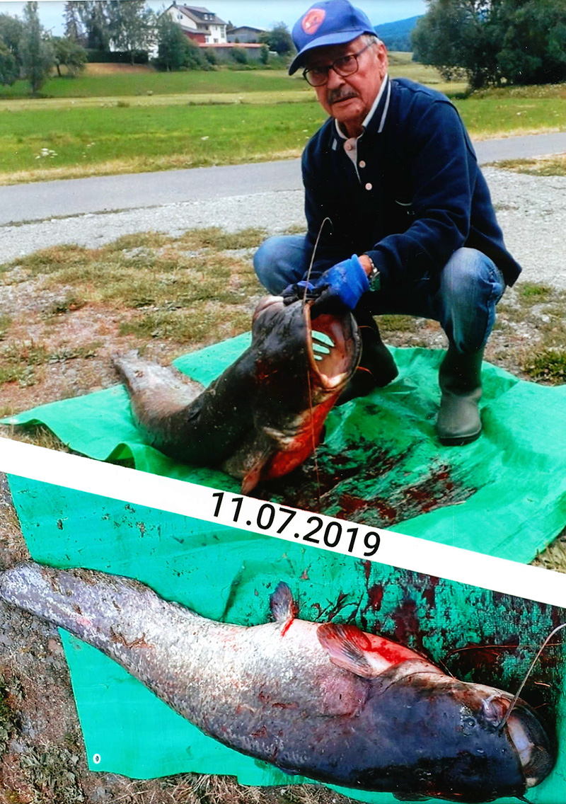 Waller, 196 cm, 46kg, ca. 30 min Drillzeit, am 27.7.19 um 01:00 Uhr, am Mathesenweiher von Siegfried Lang gefangen